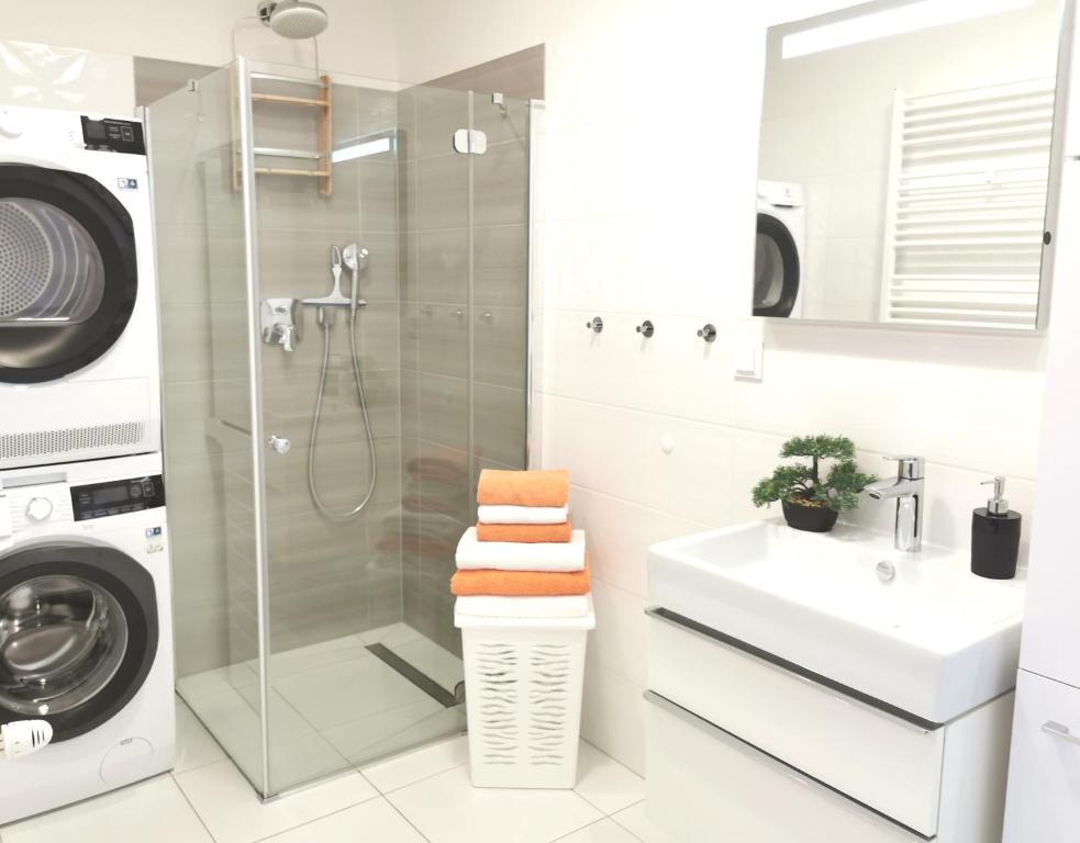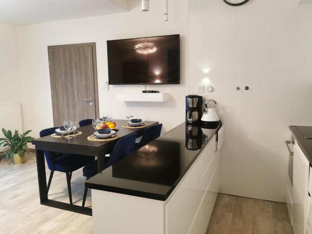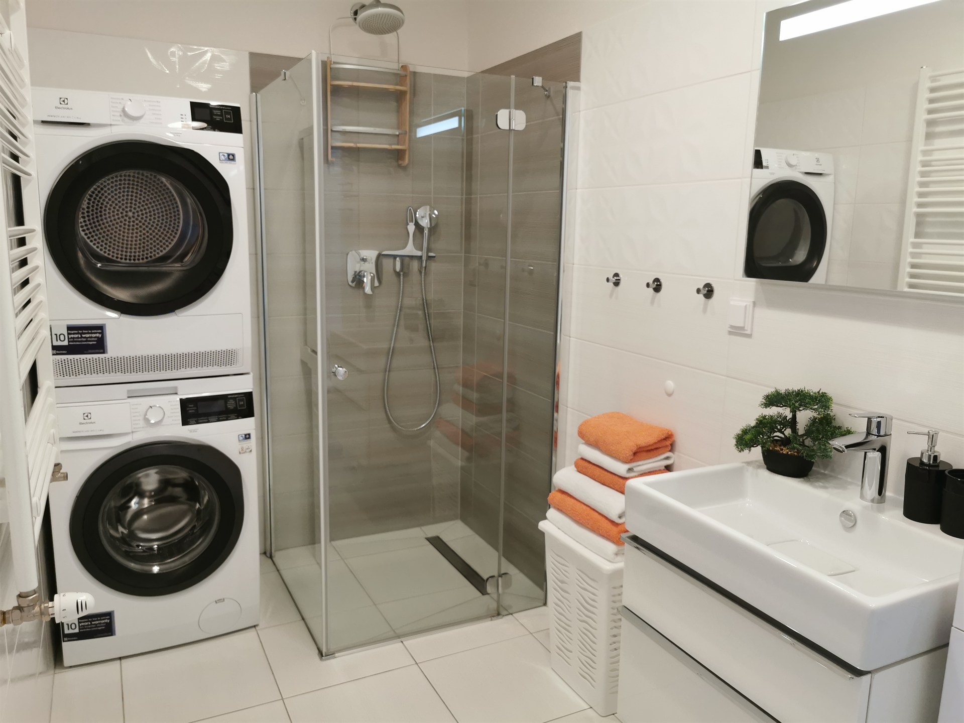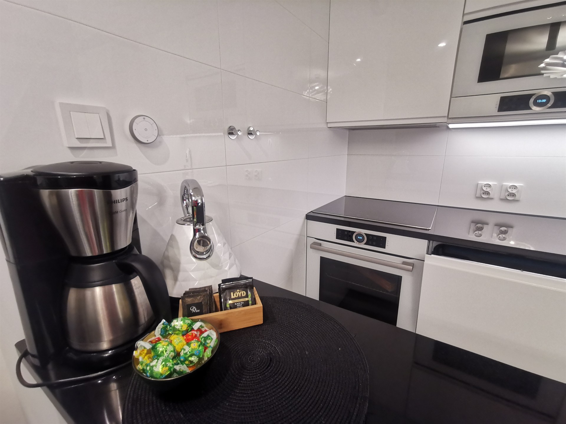 Do dyspozycji gości aneks kuchenny z pełnym wyposażeniem, w tym płytą kuchenną, piekarnikiem, kuchenką mikrofalową, lodówką, zmywarką i kompletem naczyń. W apartamencie znajduje się także łazienka z prysznicem oraz pralką i suszarką bębnową.