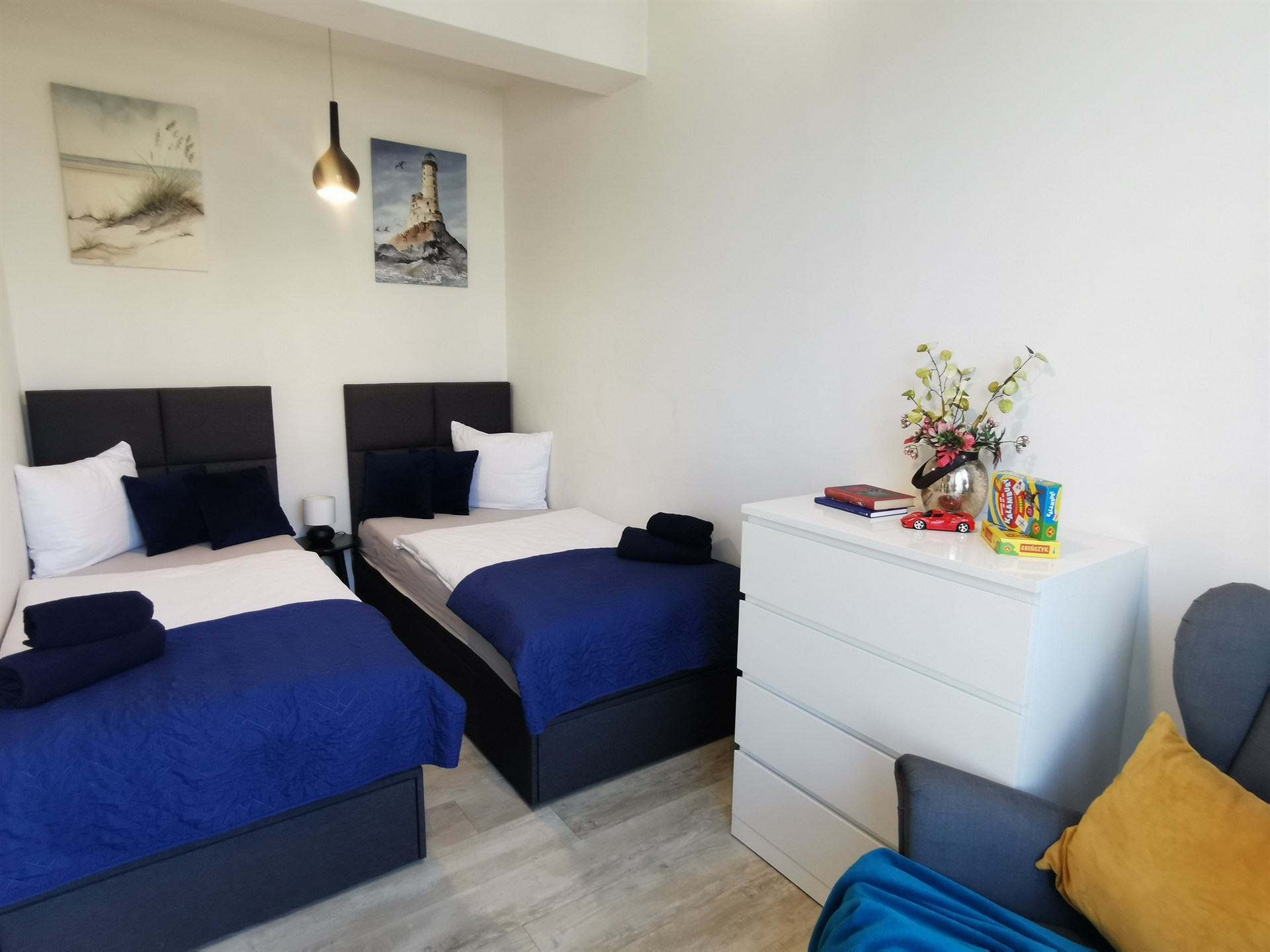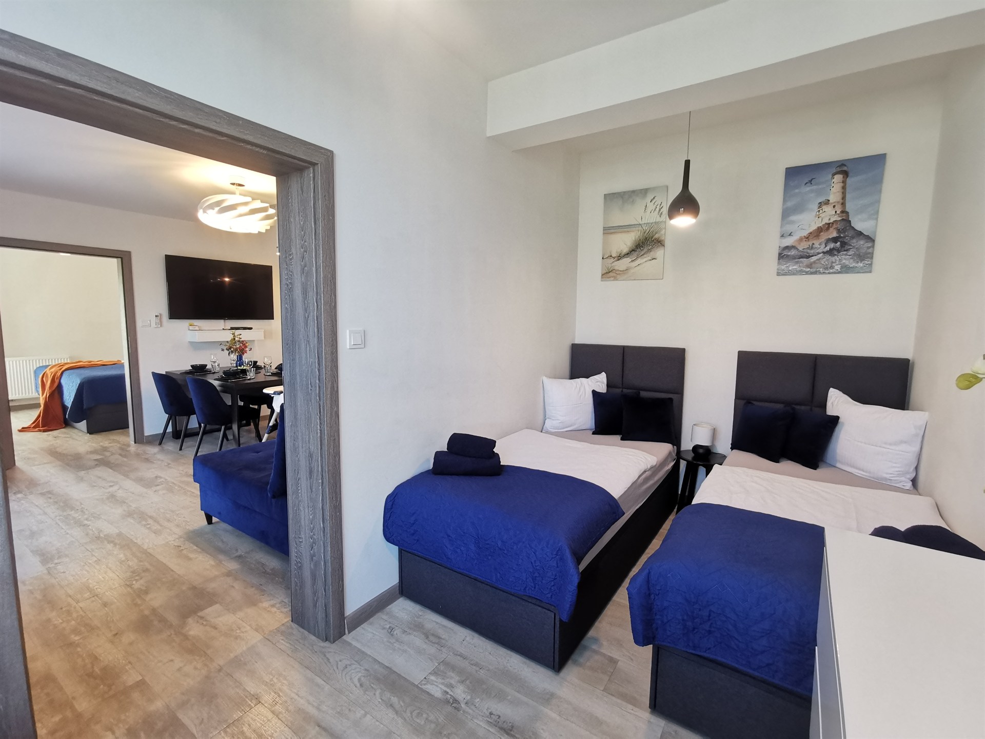 Komfortowy apartament rodzinny położony 500m od plaży o powierzchni 50 m² to idealne miejsce na spokojny pobyt nad morzem. Składa się z dwóch sypialni – jednej z dużym łóżkiem podwójnym oraz drugiej z dwoma łóżkami pojedynczymi oraz z salonu z rozkładaną sofą.