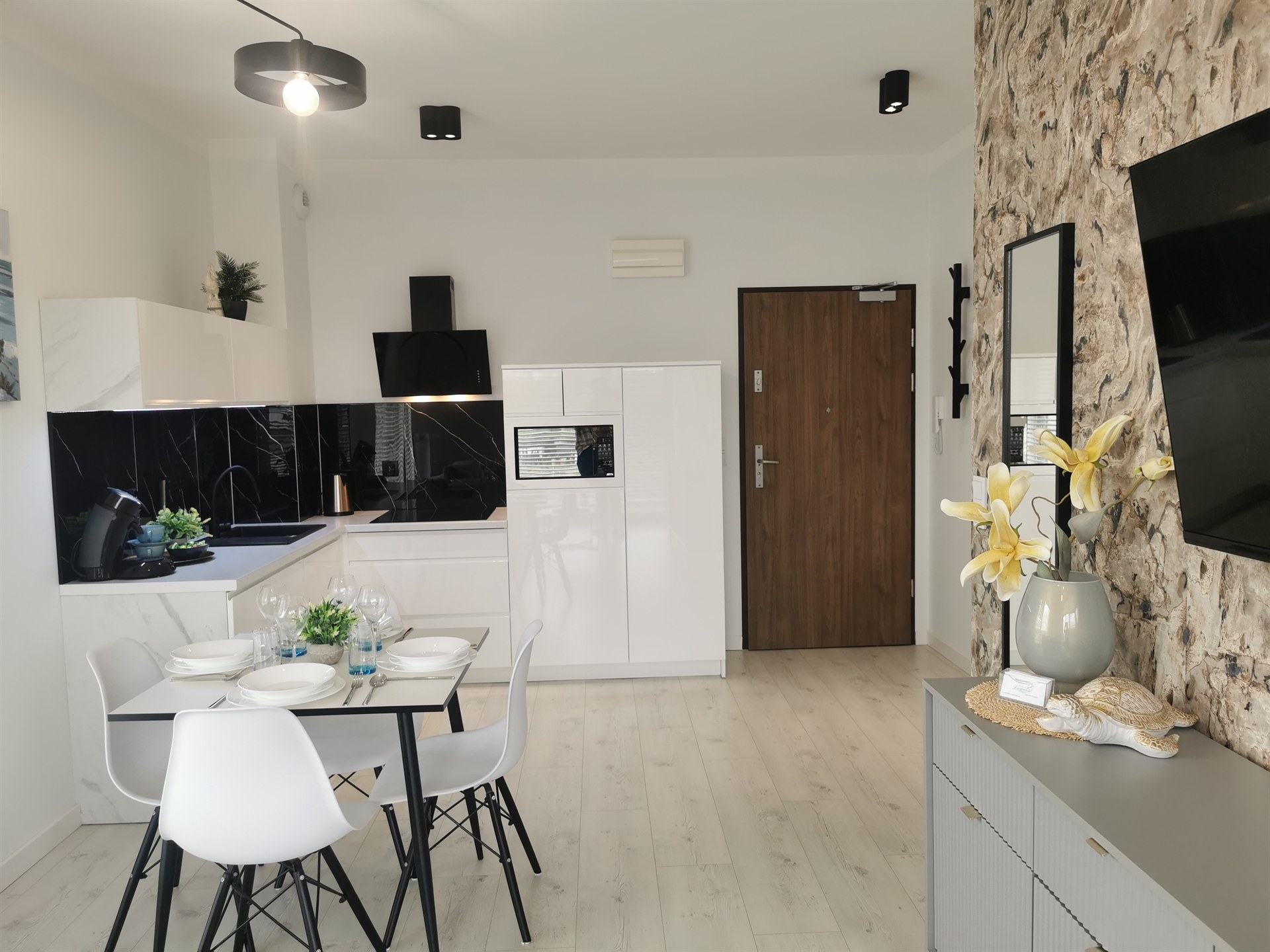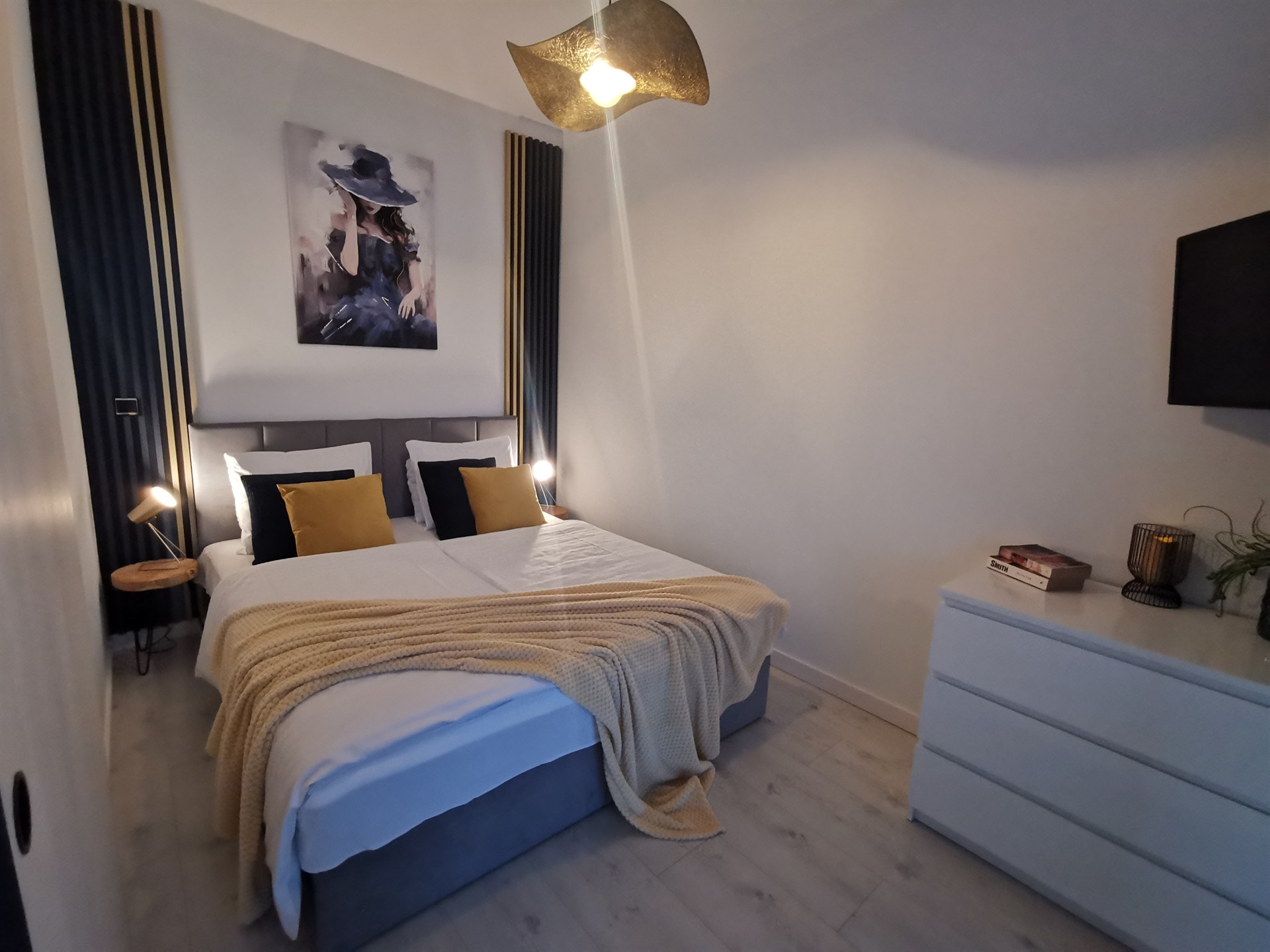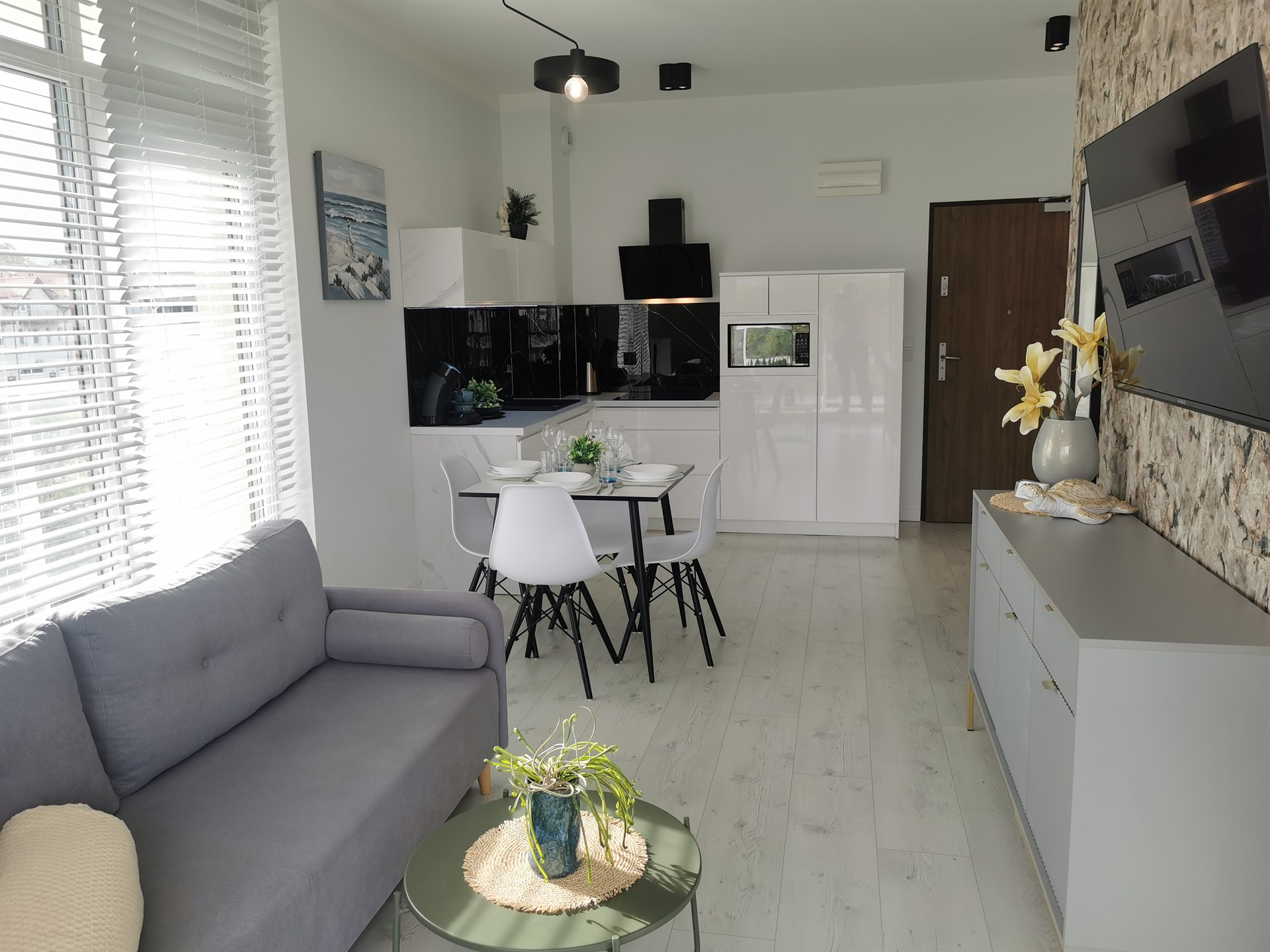 Apartament oferuje przytulną sypialnię z dużym łóżkiem, elegancki salon z rozkładaną sofą oraz nowoczesny aneks kuchenny wyposażony we wszystkie niezbędne udogodnienia, w tym zmywarkę i ekspres do kawy.