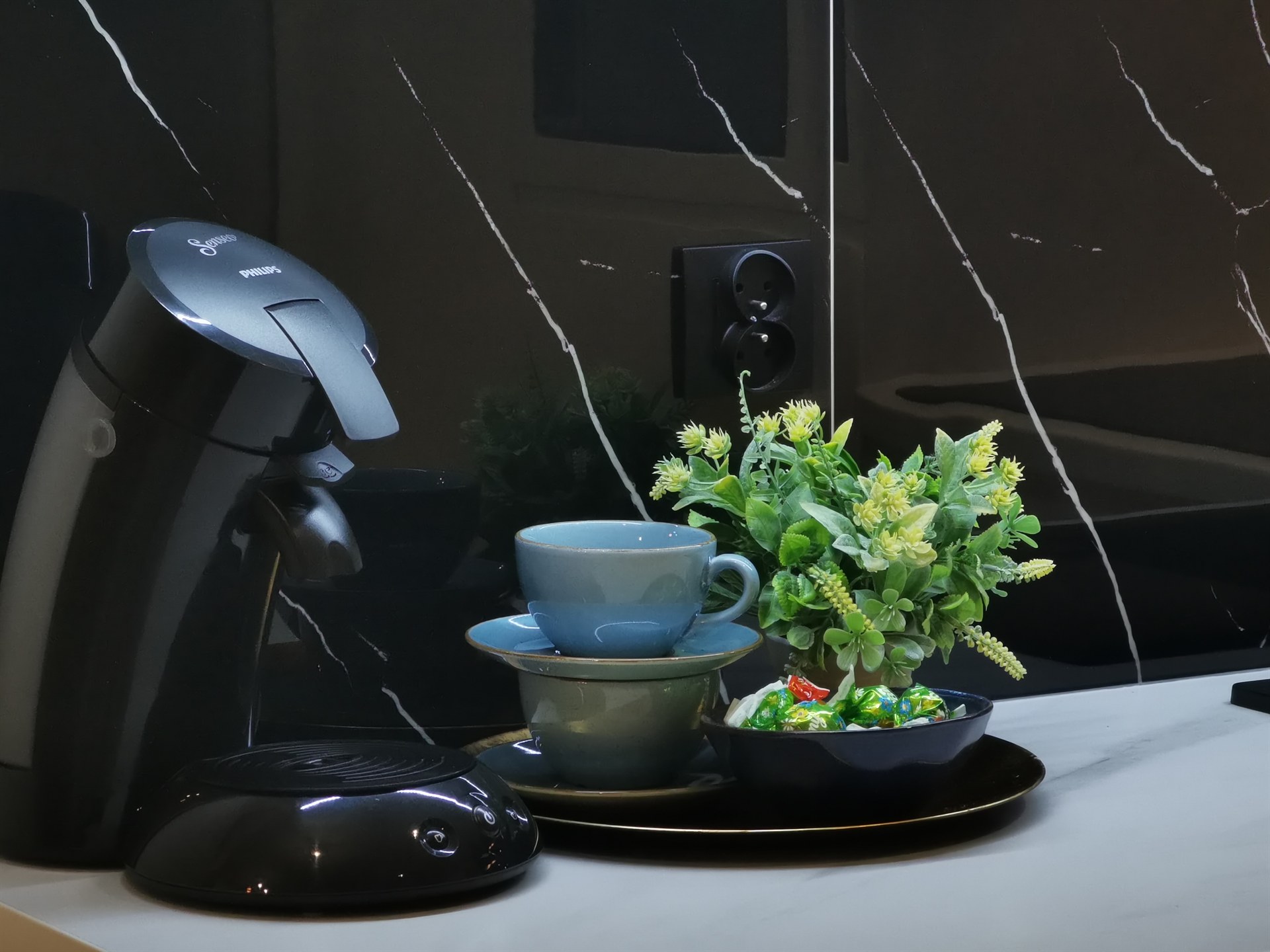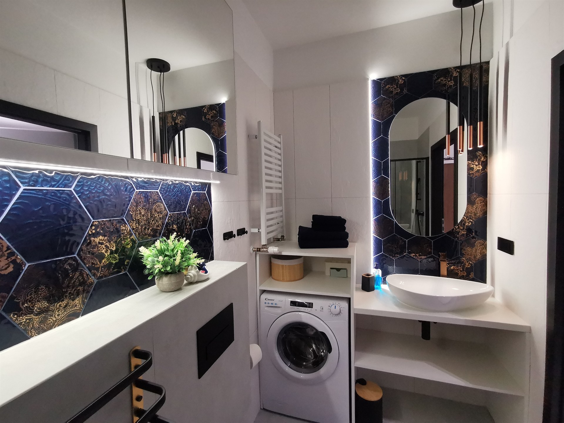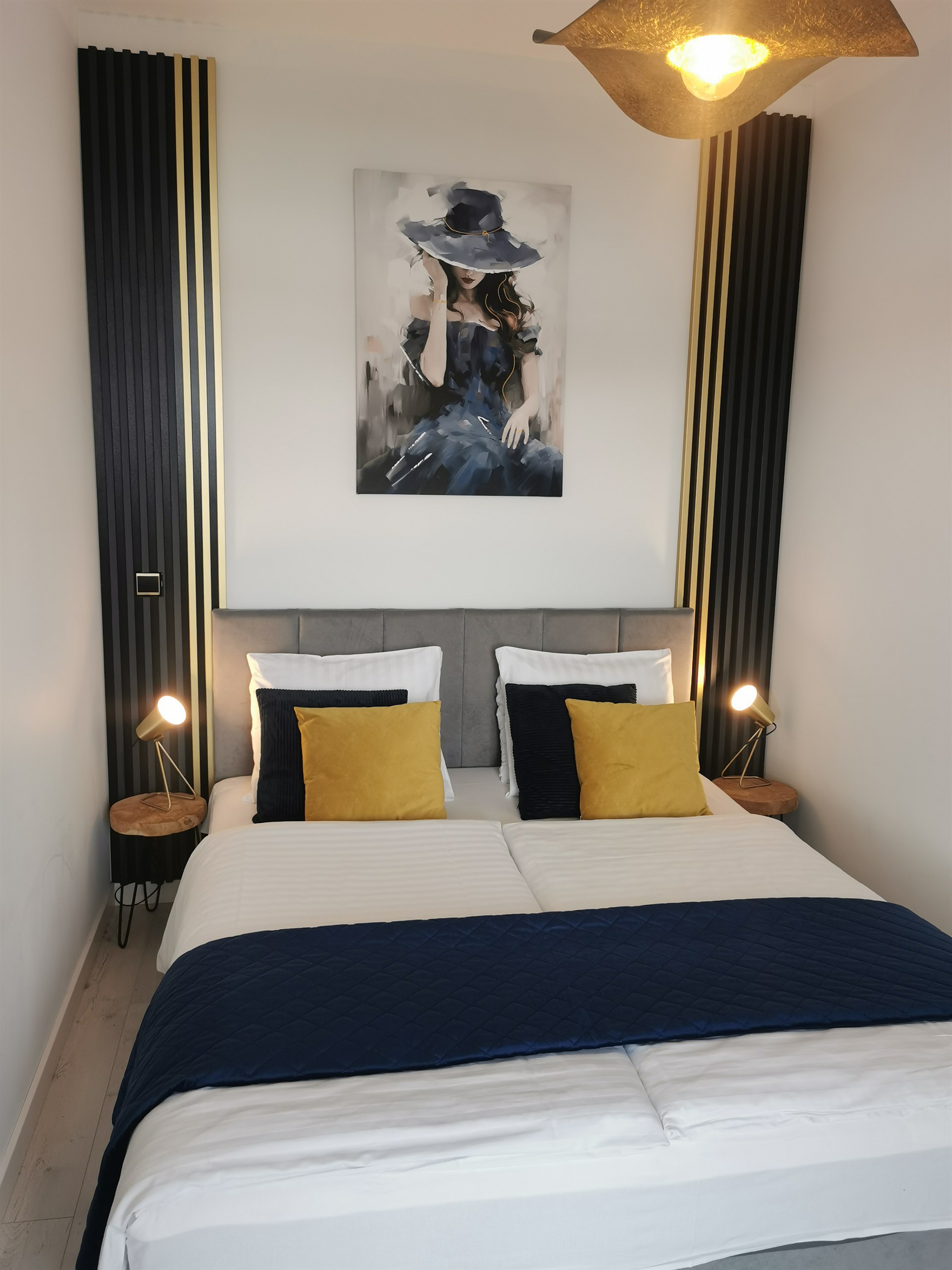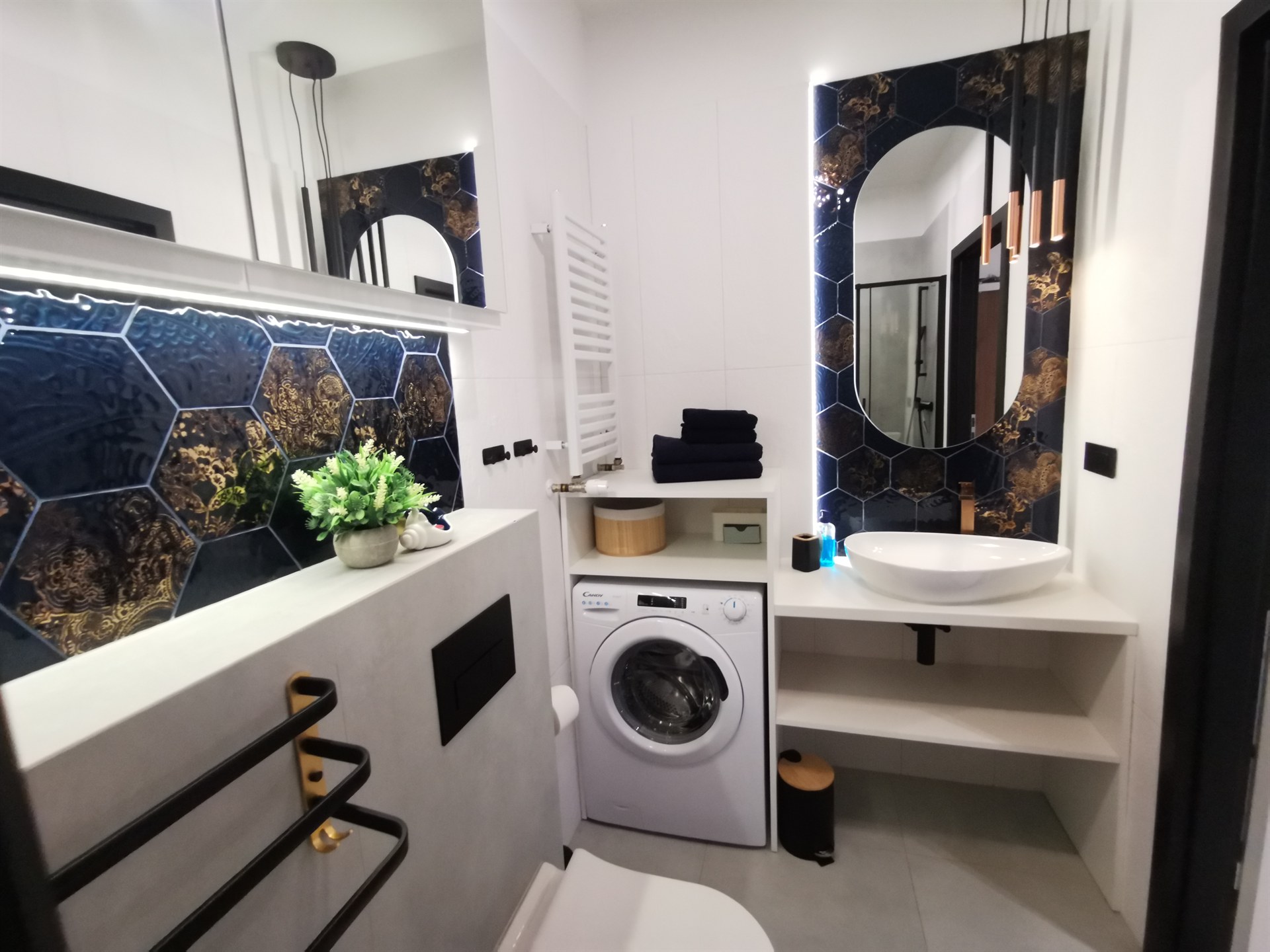 Apartament oferuje przytulną sypialnię z dużym łóżkiem, elegancki salon z rozkładaną sofą oraz nowoczesny aneks kuchenny wyposażony we wszystkie niezbędne udogodnienia, w tym zmywarkę i ekspres do kawy.