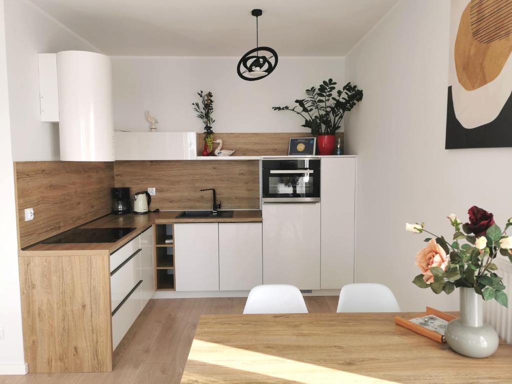 Goście mają do dyspozycji w pełni wyposażoną kuchnię z płytą, lodówką, zmywarką, ekspresem do kawy i niezbędnymi naczyniami. W apartamencie znajduje się również pralka oraz telewizor z płaskim ekranem. Z balkonu można podziwiać widok na wewnętrzny dziedziniec, a bezpłatne Wi-Fi zapewnia stały kontakt ze światem.
