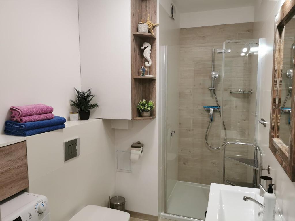 Nasz przestronny apartament o powierzchni 47 m² to idealne miejsce na wypoczynek nad morzem. Składa się z oddzielnej sypialni z dużym łóżkiem podwójnym, przytulnego salonu z rozkładaną sofą oraz prywatnej łazienki z prysznicem i suszarką do włosów.