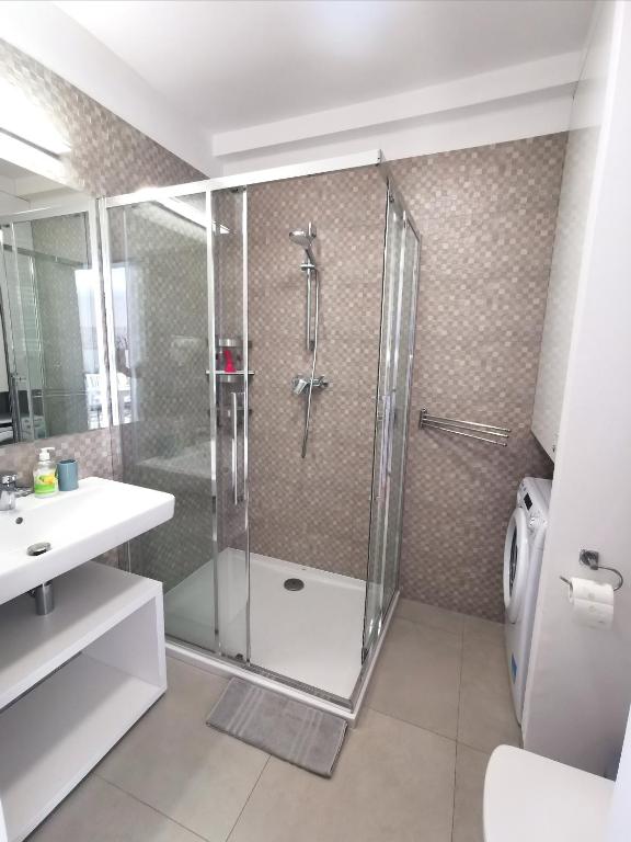 W łazience znajdziesz nowoczesny prysznic, suszarkę do włosów oraz pralkę, co zapewnia pełną swobodę nawet podczas dłuższych pobytów. Dodatkowo apartament wyposażony jest w telewizor z płaskim ekranem i dostępem do kanałów kablowych, SAT DE oraz szybkie, bezpłatne Wi-Fi.