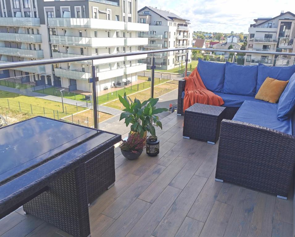 Dla tych, którzy cenią przestrzeń i bliskość natury. Duży taras z miejscem do relaksu i filiżanką kawy o poranku, otoczony z spokojem i zielenią. Tu morze spotyka się z ciszą, a czas zwalnia swój bieg.